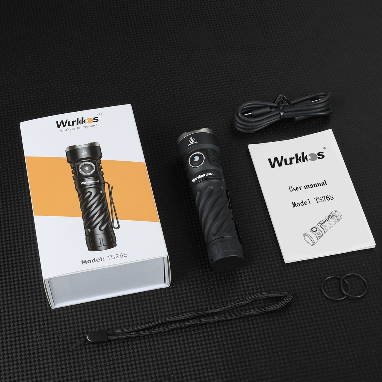 W zestawie znajdziemy latarkę Wurkkos TS26S, akumulator 21700 Li-ion oraz kabel USB-C 5V 2A.